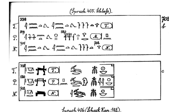 ついでに『男とバーの対話』(Pベルリン3024)の27行目には「イスデスが聖なる部屋で私を弁護するようにxsf Isds Hr=i m at Dsrt」とあって、この「聖なる部屋」は裁判の間のことらしい。上の参考サイトにあるように、イスデスは死者の書において、冥界の裁判の間に関係する神っぽい。(なので両方と近い感じなのね)(ここは、並列の文にトトがすでに出てるので、どちらかと言われればアヌビスだ、となるみたい) 図が獣頭の場合、ジャッカルだったりトキだったりヒヒだったりするらしい。