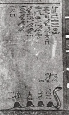 i ra r=sn pr=sn am xr=s sn qAbw=s r app=f Hr=sn ラーが彼ら(頭たち)へ声をかけると、彼らはそのもとでそれら(蛇腹?ヘビの体のうねうね)を飲み込むためその蛇腹から出てくる、彼(ラー)が彼らの上を通り過ぎるために。aq xr tpw m qAbw=sn m-xtそのあと頭たちはそれらの蛇腹の中に入る。iwty ir.wy n HfAw pn iwty fnD=f iwty anx.wy=fyそのヘビには両目がなく、鼻がなく、両耳もない。srx=f m hmhmt=f anx=f m Dwi=f Ds=f彼は彼の咆哮によって呼吸し、彼自身の呼びかけによって生きる。