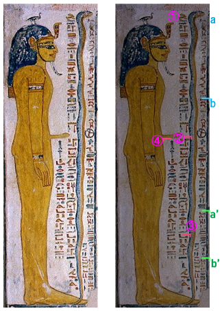 | nTrt{y} tn m sxr pn この女神はこのイメージで存在している。 app nTr pn aA Hr Drty.sy この大いなる神は彼女の両手の上で横切る。 tpy (r) imnt{y} S{T}tAyt Hkn=f n nTr aA シュタアイトの右のテピイ(蛇)、彼は大いなる神を称える。 tp StAyt m dwAt Hr(y)t rdwy.{n}<s>y m dwAt Xr(y)t{t} シュタアイトの頭は上のドゥアト、彼女の両腕は下のドゥアトにある。 bAwy ap=f XAt=s ふたつのバーは彼女の遺体を横切る。 |