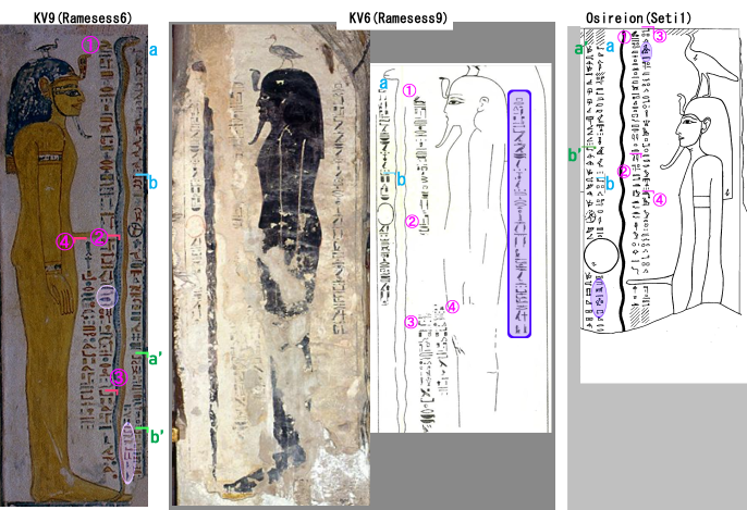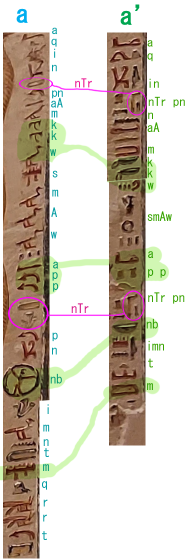 | 【aの文】 aq in nTr pn {n} aA m kkw smAw この大いなる神(ラー)が統合されし闇の中に入ること。 app nTr pn nb imnt m qrrt この神、西方の主人(オシリス)が通り過ぎるのは、洞窟※である。 ※この部分はa'の文では損傷してよめないが、aから読み取れる。 | |