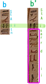 | 【bの文】 StAyt dr(w) rdy 神秘的な場所。鎮圧する両足。(両足が鎮圧する場所、かも…ここは訳例がなくて) ※この部分はb'にしか書かれない。そして暗号表記になっている。 (巨女神像にもこういう部分がある。洞窟の書の他の部分にもあるらしい) |