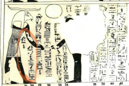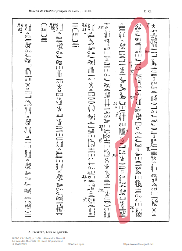 | ①wnn nTr pn m sxrw pn m-Xnw qrrt=f StA.ti この神は神秘的な状態の彼の洞窟の内側でこのイメージとして存在する。 ②nTr pn aA mdw=f n=f ir=f aHaw Hr nD sxrw=f この大いなる神(ラー)は彼に話す、彼のイメージに呼びかける時を作るために。(参考訳ではaHa(w)を「停まる」と訳している) ③app nTr pn Wsir m-xt Ra この神、オシリス※→は、ラーに付き従って通り過ぎる。 ④HAp.xr kkw XAwt m-xt app nTr pn aA Hr=sn そして、この大いなる神がそれらを通り過ぎたあと、骸を闇が覆い隠す。 | ※ |