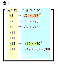 この「表1」は、左の分数を倍にしたとき、単位分数の和でどう表記すればよいかを、右に書いています。